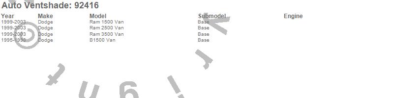 Below is an abbreviated list of applications for the Ventvisor Deflector 2 pc..B1500 Van, Ram 1500 Van, Ram 2500 Van, Ram 3500 Van, Dodge, 2003, 2002, 2001, 2000, 1999, 1998, 1997, 1996, 1995
