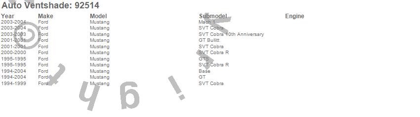 Below is an abbreviated list of applications for the Ventvisor Deflector 2 pc..Mustang, Ford, 2004, 2003, 2002, 2001, 2000, 1999, 1998, 1997, 1996, 1995, 1994