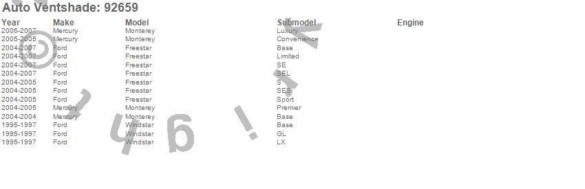 Below is an abbreviated list of applications for the Ventvisor Deflector 2 pc..Freestar, Monterey, Windstar, Ford, Mercury, 2007, 2006, 2005, 2004, 1997, 1996, 1995