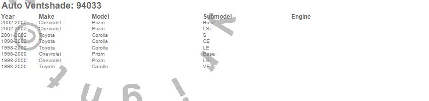 Below is an abbreviated list of applications for the Ventvisor Deflector 4 pc..Corolla, Prizm, Chevrolet, Toyota, 2002, 2001, 2000, 1999, 1998