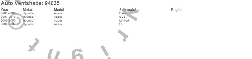 Below is an abbreviated list of applications for the Ventvisor Deflector 4 pc..Azera, Hyundai, 2010, 2009, 2008, 2007, 2006