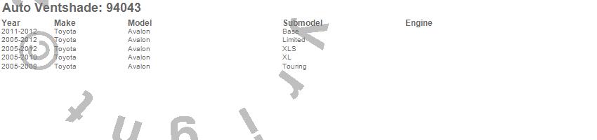 Below is an abbreviated list of applications for the Ventvisor Deflector 4 pc..Avalon, Toyota, 2012, 2011, 2010, 2009, 2008, 2007, 2006, 2005