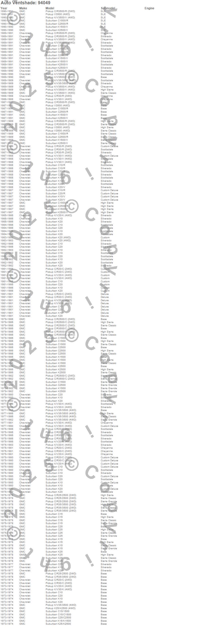 Below is an abbreviated list of applications for the Ventvisor Deflector 4 pc..C10 Suburban, C15 Suburban, C15/C1500 Suburban, C1500 Suburban, C20 Pickup, C20 Suburban, C25 Suburban, C25/C2500 Pickup, C25/C2500 Suburban, C2500 Pickup, C2500 Suburban, C30 Pickup, C35/C3500 Pickup, C3500 Pickup, K10 Suburban, K15 Suburban, K15/K1500 Suburban, K1500 Suburban, K20 Pickup, K20 Suburban