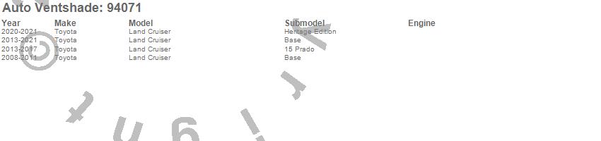 Below is an abbreviated list of applications for the Ventvisor Deflector 4 pc..Land Cruiser, Toyota, 2021, 2020, 2019, 2018, 2017, 2016, 2015, 2014, 2013, 2011, 2010, 2009, 2008