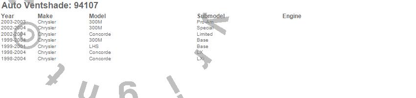 Below is an abbreviated list of applications for the Ventvisor Deflector 4 pc..300M, Concorde, LHS, Chrysler, 2004, 2003, 2002, 2001, 2000, 1999, 1998