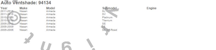 Below is an abbreviated list of applications for the Ventvisor Deflector 4 pc..Armada, Nissan, 2015, 2014, 2013, 2012, 2011, 2010, 2009, 2008, 2007, 2006, 2005