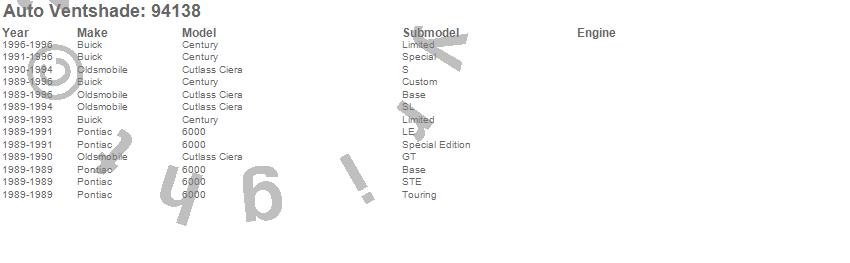 Below is an abbreviated list of applications for the Ventvisor Deflector 4 pc..6000, Century, Cutlass Ciera, Buick, Oldsmobile, Pontiac, 1996, 1995, 1994, 1993, 1992, 1991, 1990, 1989