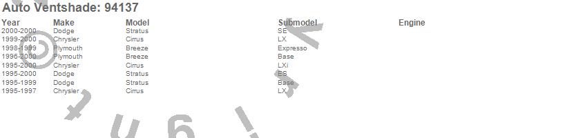 Below is an abbreviated list of applications for the Ventvisor Deflector 4 pc..Breeze, Cirrus, Stratus, Chrysler, Dodge, Plymouth, 2000, 1999, 1998, 1997, 1996, 1995