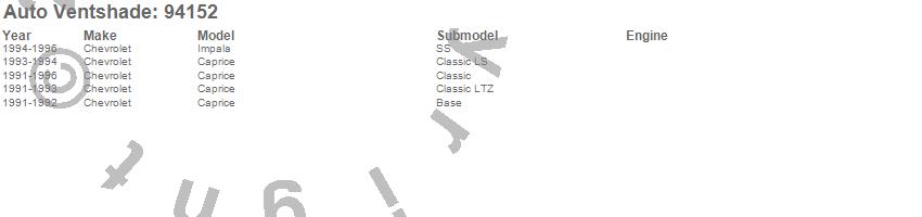Below is an abbreviated list of applications for the Ventvisor Deflector 4 pc..Caprice, Impala, Chevrolet, 1996, 1995, 1994, 1993, 1992, 1991
