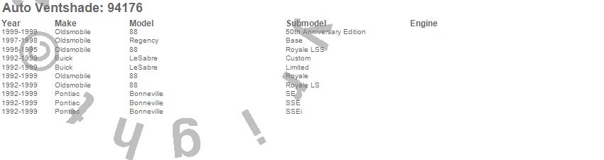 Below is an abbreviated list of applications for the Ventvisor Deflector 4 pc..88, Bonneville, LeSabre, Regency, Buick, Oldsmobile, Pontiac, 1999, 1998, 1997, 1996, 1995, 1994, 1993, 1992