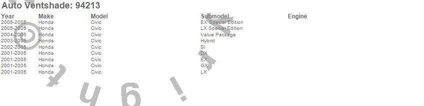 Below is an abbreviated list of applications for the Ventvisor Deflector 4 pc..Civic, Honda, 2005, 2004, 2003, 2002, 2001