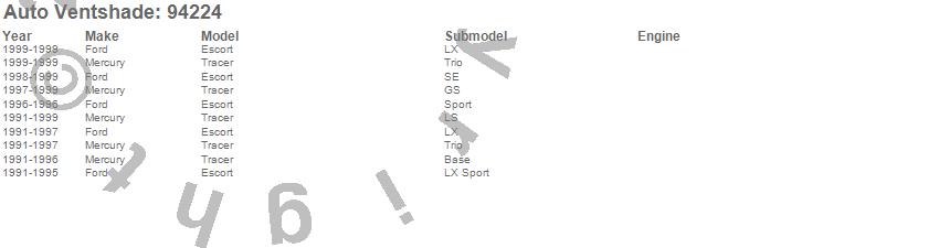 Below is an abbreviated list of applications for the Ventvisor Deflector 4 pc..Escort, Tracer, Ford, Mercury, 1999, 1998, 1997, 1996, 1995, 1994, 1993, 1992, 1991