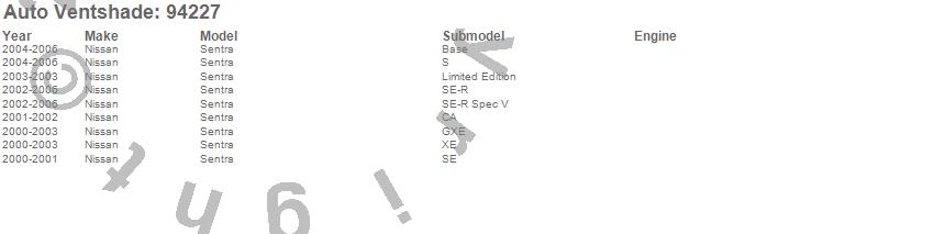 Below is an abbreviated list of applications for the Ventvisor Deflector 4 pc..Sentra, Nissan, 2006, 2005, 2004, 2003, 2002, 2001, 2000