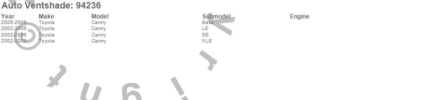 Below is an abbreviated list of applications for the Ventvisor Deflector 4 pc..Camry, Toyota, 2006, 2005, 2004, 2003, 2002