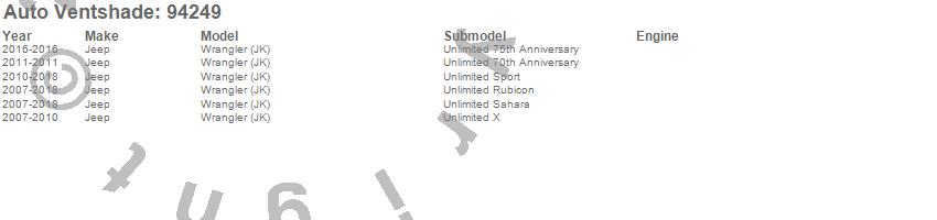 Below is an abbreviated list of applications for the Ventvisor Deflector 4 pc..Wrangler (JK), Jeep, 2018, 2017, 2016, 2015, 2014, 2013, 2012, 2011, 2010, 2009, 2008, 2007