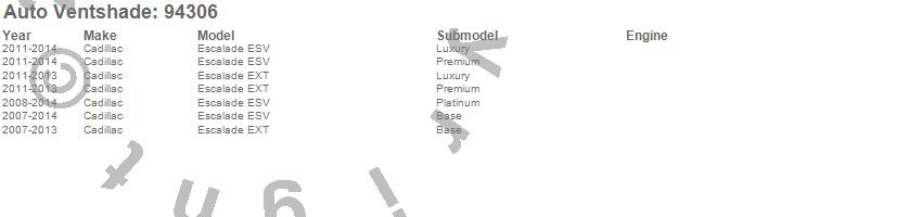 Below is an abbreviated list of applications for the Ventvisor Deflector 4 pc..Escalade ESV, Escalade EXT, Cadillac, 2014, 2013, 2012, 2011, 2010, 2009, 2008, 2007