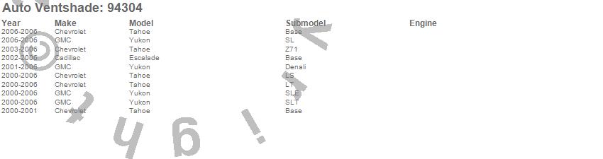 Below is an abbreviated list of applications for the Ventvisor Deflector 4 pc..Escalade, Tahoe, Yukon, Cadillac, Chevrolet, GMC, 2006, 2005, 2004, 2003, 2002, 2001, 2000
