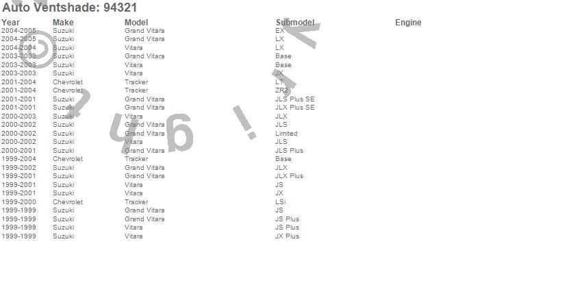 Below is an abbreviated list of applications for the Ventvisor Deflector 4 pc..Grand Vitara, Tracker, Vitara, Chevrolet, Suzuki, 2005, 2004, 2003, 2002, 2001, 2000, 1999