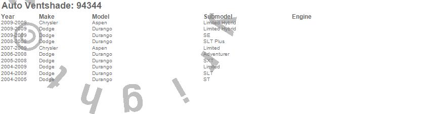 Below is an abbreviated list of applications for the Ventvisor Deflector 4 pc..Aspen, Durango, Chrysler, Dodge, 2009, 2008, 2007, 2006, 2005, 2004