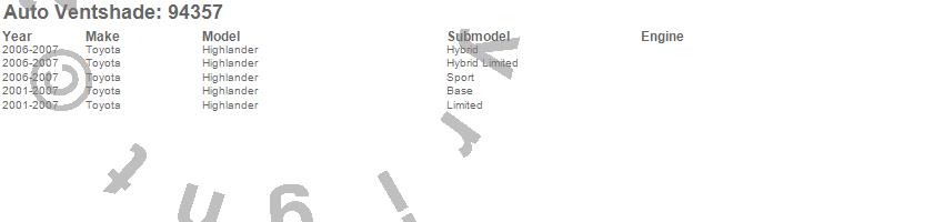 Below is an abbreviated list of applications for the Ventvisor Deflector 4 pc..Highlander, Toyota, 2007, 2006, 2005, 2004, 2003, 2002, 2001