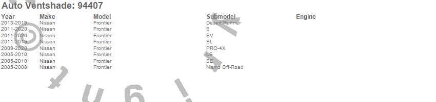 Below is an abbreviated list of applications for the Ventvisor Deflector 4 pc..Frontier, Nissan, 2020, 2019, 2018, 2017, 2016, 2015, 2014, 2013, 2012, 2011, 2010, 2009, 2008, 2007, 2006, 2005