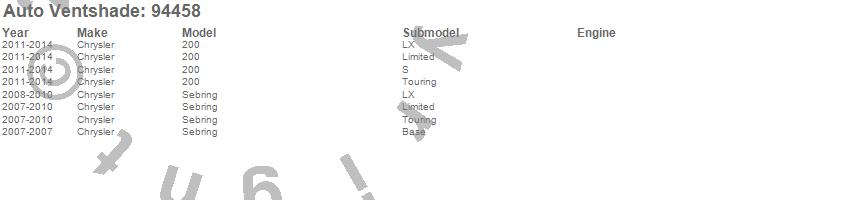 Below is an abbreviated list of applications for the Ventvisor Deflector 4 pc..200, Sebring, Chrysler, 2014, 2013, 2012, 2011, 2010, 2009, 2008, 2007