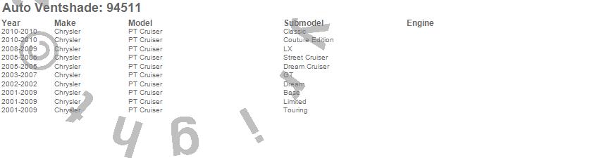 Below is an abbreviated list of applications for the Ventvisor Deflector 4 pc..PT Cruiser, Chrysler, 2010, 2009, 2008, 2007, 2006, 2005, 2004, 2003, 2002, 2001