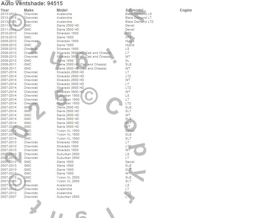 Below is an abbreviated list of applications for the Ventvisor Deflector 4 pc..Avalanche, Sierra 1500, Sierra 2500 HD, Sierra 3500 HD, Silverado 1500, Silverado 2500 HD, Silverado 3500, Silverado 3500 HD, Suburban 1500, Suburban 2500, Yukon XL 1500, Yukon XL 2500, Chevrolet, GMC, 2014, 2013, 2012, 2011, 2010, 2009