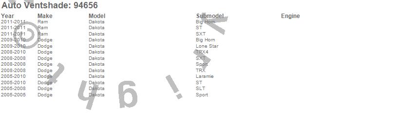 Below is an abbreviated list of applications for the Ventvisor Deflector 4 pc..Dakota, Dodge, Ram, 2011, 2010, 2009, 2008, 2007, 2006, 2005