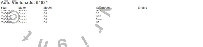 Below is an abbreviated list of applications for the Ventvisor Deflector 4 pc..G6, Pontiac, 2010, 2009, 2008, 2007, 2006, 2005