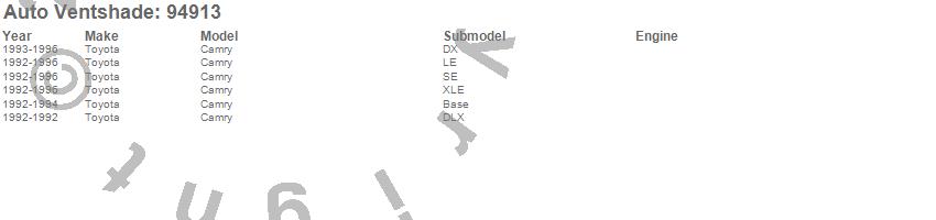 Below is an abbreviated list of applications for the Ventvisor Deflector 4 pc..Camry, Toyota, 1996, 1995, 1994, 1993, 1992