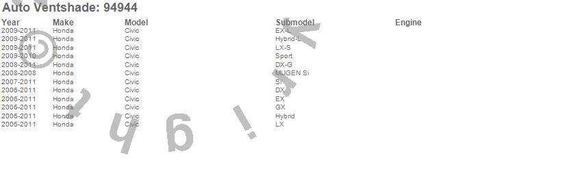 Below is an abbreviated list of applications for the Ventvisor Deflector 4 pc..Civic, Honda, 2011, 2010, 2009, 2008, 2007, 2006