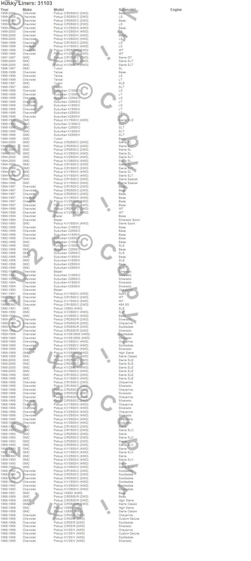 Below is an abbreviated list of applications for the Classic Style Floor Liner.Blazer, C1500 Pickup, C1500 Suburban, C2500 Pickup, C2500 Suburban, C3500 Pickup, K1500, K1500 Pickup, K1500 Suburban, K2500 Pickup, K2500 Suburban, K3500 Pickup, R2500 Pickup, R30 Pickup, R3500 Pickup, Tahoe, V30 Pickup, V3500 Pickup, Yukon, Chevrolet