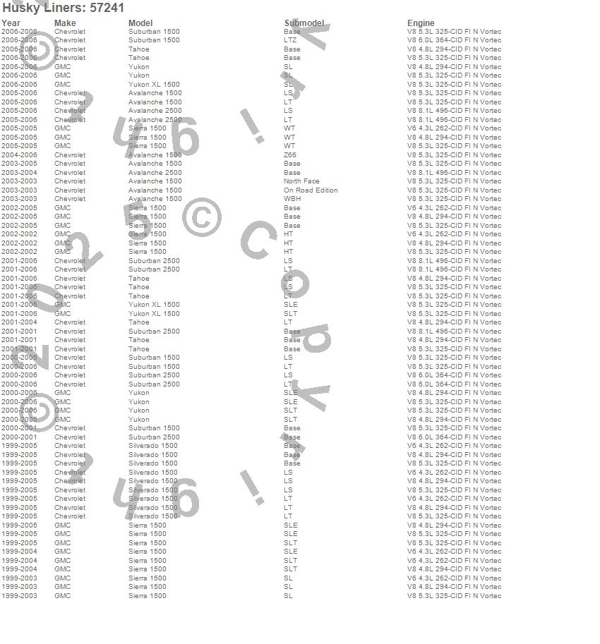 Below is an abbreviated list of applications for the Custom Molded Mud Guards.Avalanche 1500, Avalanche 2500, Sierra 1500, Silverado 1500, Suburban 1500, Suburban 2500, Tahoe, Yukon, Yukon XL 1500, Chevrolet, GMC, 2006, 2005, 2004, 2003, 2002, 2001, 2000, 1999