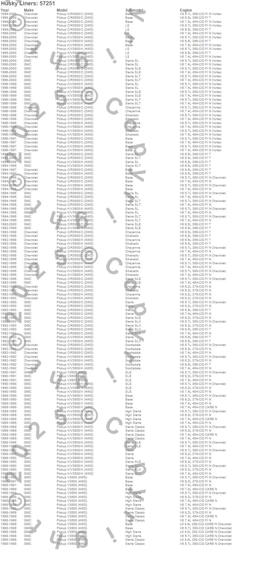 Below is an abbreviated list of applications for the Custom Molded Mud Guards.C3500 Pickup, K3500 Pickup, V3500 Pickup, Chevrolet, GMC, 2000, 1999, 1998, 1997, 1996, 1995, 1994, 1993, 1992, 1991, 1990, 1989, 1988