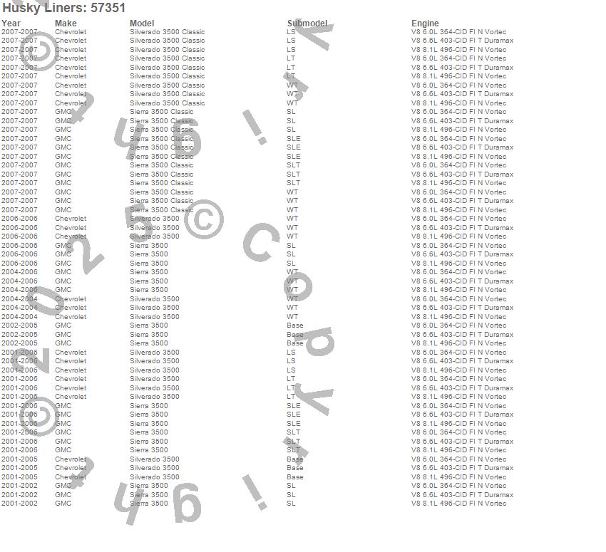 Below is an abbreviated list of applications for the Custom Molded Mud Guards.Sierra 3500, Sierra 3500 Classic, Silverado 3500, Silverado 3500 Classic, Chevrolet, GMC, 2007, 2006, 2005, 2004, 2003, 2002, 2001