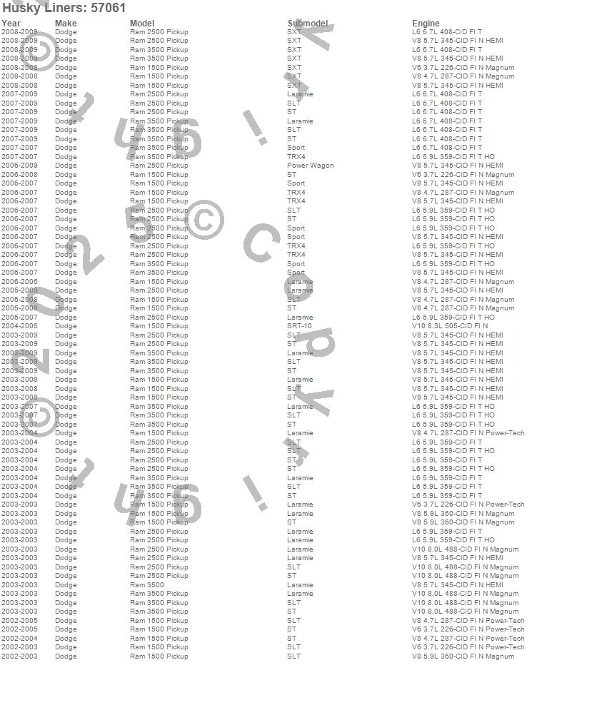 Below is an abbreviated list of applications for the Custom Molded Mud Guards.Ram 1500, Ram 2500, Ram 3500, Dodge, 2009, 2008, 2007, 2006, 2005, 2004, 2003, 2002