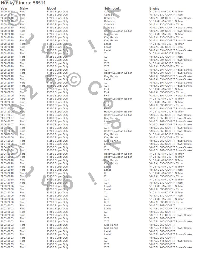 Below is an abbreviated list of applications for the Custom Molded Mud Guards.F-250 Super Duty, F-350 Super Duty, Ford, 2010, 2009, 2008, 2007, 2006, 2005, 2004, 2003
