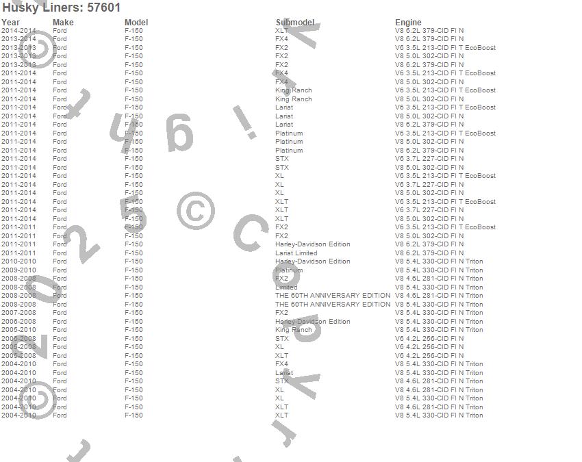 Below is an abbreviated list of applications for the Custom Molded Mud Guards.F-150, Ford, 2014, 2013, 2012, 2011, 2010, 2009, 2008, 2007, 2006, 2005, 2004