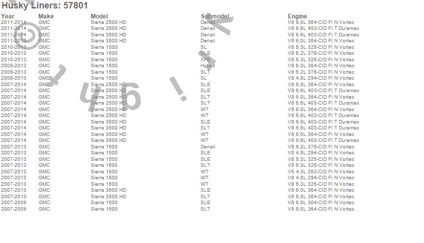 Below is an abbreviated list of applications for the Custom Molded Mud Guards.Sierra 1500, Sierra 2500 HD, Sierra 3500 HD, GMC, 2014, 2013, 2012, 2011, 2010, 2009, 2008, 2007