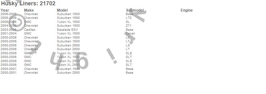Below is an abbreviated list of applications for the Classic Style Cargo Liner.Escalade ESV, Suburban 1500, Suburban 2500, Yukon XL 1500, Yukon XL 2500, Cadillac, Chevrolet, GMC, 2006, 2005, 2004, 2003, 2002, 2001, 2000
