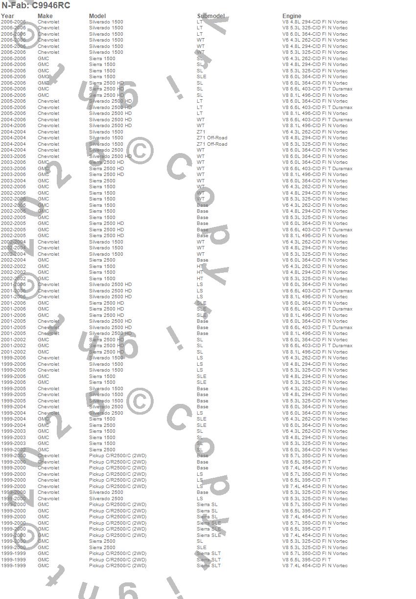 Below is an abbreviated list of applications for the Cab Length Nerf Step Bar.C2500 Pickup, Sierra 1500, Sierra 2500, Sierra 2500 HD, Silverado 1500, Silverado 2500, Silverado 2500 HD, Chevrolet, GMC, 2006, 2005, 2004, 2003, 2002, 2001, 2000, 1999