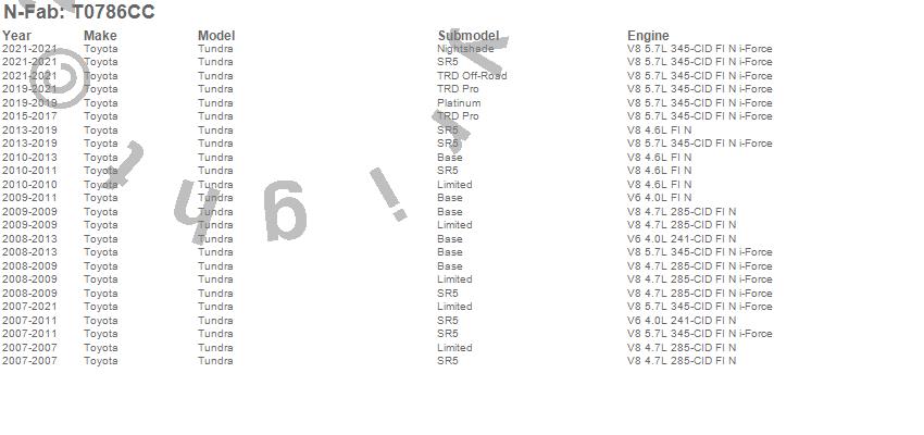 Below is an abbreviated list of applications for the Wheel To Wheel Nerf Step Bar.Tundra, Toyota, 2021, 2020, 2019, 2018, 2017, 2016, 2015, 2014, 2013, 2012, 2011, 2010, 2009, 2008, 2007