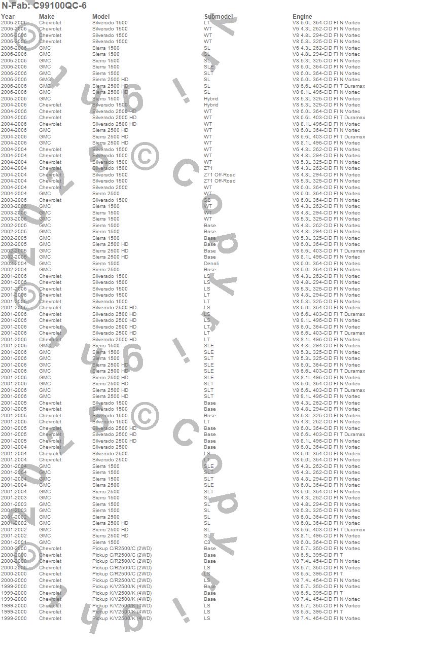 Below is an abbreviated list of applications for the Wheel To Wheel Nerf Step Bar w/Bed Access.C2500 Pickup, K2500 Pickup, Sierra 1500, Sierra 2500, Sierra 2500 HD, Silverado 1500, Silverado 2500, Silverado 2500 HD, Chevrolet, GMC, 2006, 2005, 2004, 2003, 2002, 2001, 2000, 1999