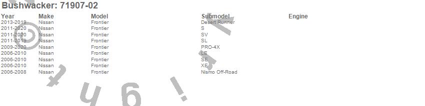 Below is an abbreviated list of applications for the Boss Pocket Style Fender Flares.Frontier, Nissan, 2020, 2019, 2018, 2017, 2016, 2015, 2014, 2013, 2012, 2011, 2010, 2009, 2008, 2007, 2006