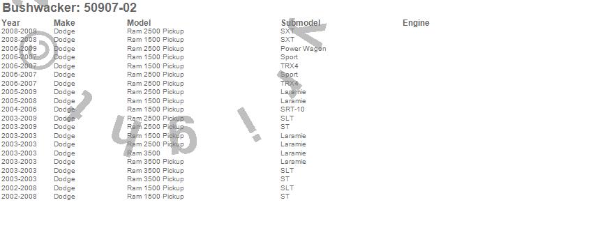 Below is an abbreviated list of applications for the Pocket Style Fender Flares.Ram 1500, Ram 2500, Ram 3500, Dodge, 2009, 2008, 2007, 2006, 2005, 2004, 2003, 2002