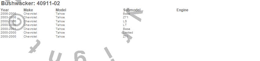 Below is an abbreviated list of applications for the Extend-A-Fender Flares.Tahoe, Chevrolet, 2006, 2005, 2004, 2003, 2002, 2001, 2000