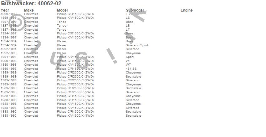 Below is an abbreviated list of applications for the Pocket Style Fender Flares.Blazer, C1500 Pickup, C2500 Pickup, K1500 Pickup, R2500 Pickup, Tahoe, Chevrolet, 1999, 1998, 1997, 1996, 1995, 1994, 1993, 1992, 1991, 1990, 1989, 1988