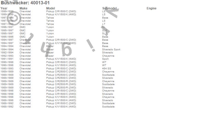 Below is an abbreviated list of applications for the Extend-A-Fender Flares.Blazer, C1500 Pickup, C2500 Pickup, K1500 Pickup, R2500 Pickup, Tahoe, Yukon, Chevrolet, GMC, 1999, 1998, 1997, 1996, 1995, 1994, 1993, 1992, 1991, 1990, 1989