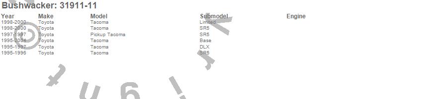 Below is an abbreviated list of applications for the Extend-A-Fender Flares.Tacoma, Toyota, 2004, 2003, 2002, 2001, 2000, 1999, 1998, 1997, 1996, 1995